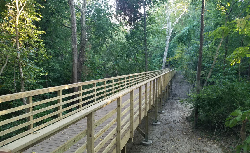 Due to limited access points, construction materials were brought in from both ends of the project. A concrete trail was built along steep downhill slopes, offering scenic views of the stream. Elevated boardwalks were constructed across major waterways to help maintain the surrounding green space. MegaKC's craftsmanship in building wooden boardwalks with composite decking allows visitors to experience the greenway among the trees. This project demonstrates how parkland can be accessible to all users and was a collaboration between MegaKC and CFS Engineers.